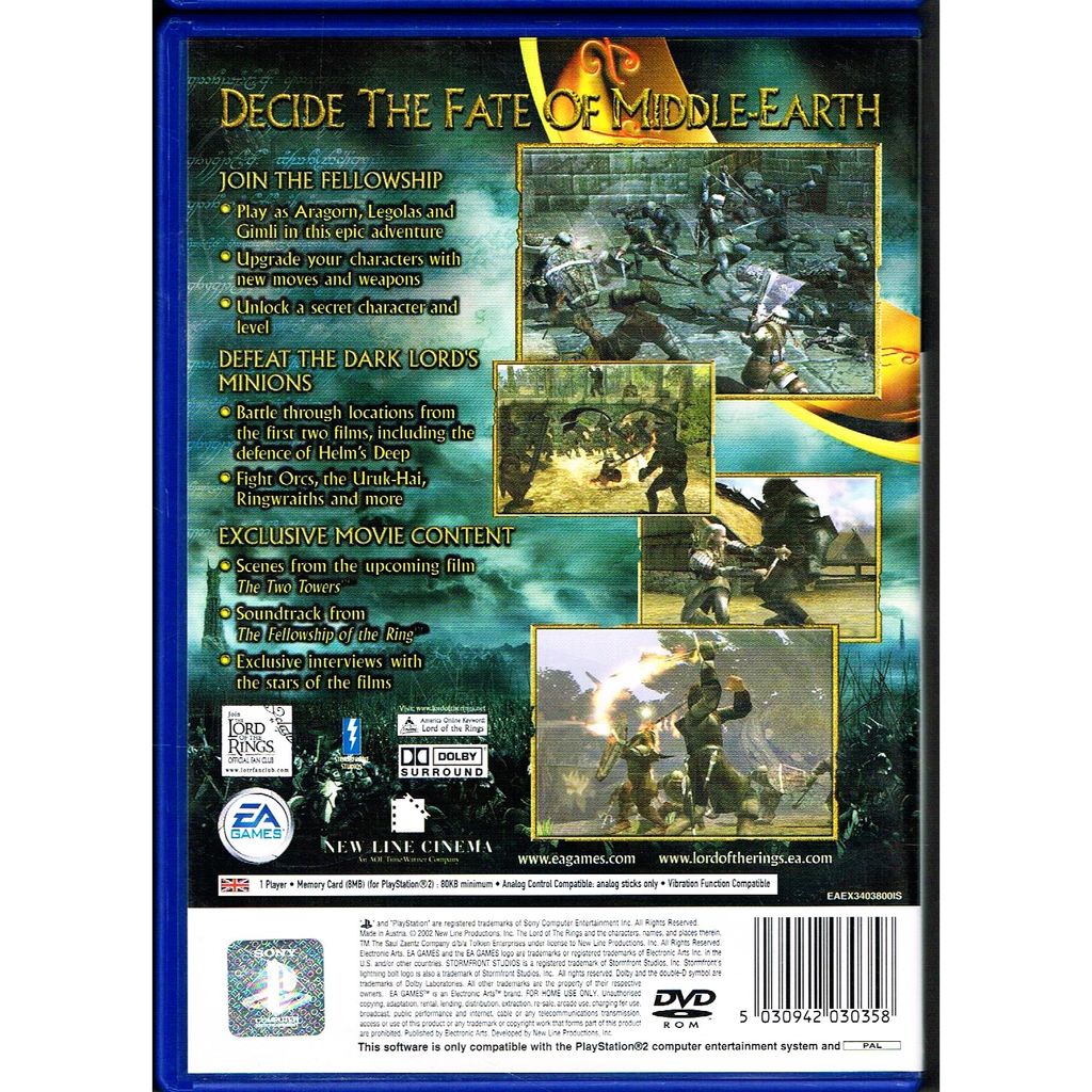 Precis som väntat av namnet är det här spelet direkt länkat till Peter Jacksons De två tornen-filmen, men det tar inte slut där. Nej då, EA har även tagit med lika mycket action från 2001-toppfilmen, Härskarringen. Generöst, eller hur? Spelet är en slags Golden Axe för den nya generationen, och är en slaktfest i tredjepersonsperspektiv där du kämpar mot orcharméerna i rollen av en av de tre brödraskapshjältarna: Aragorn, Legolas eller Gimli. Ta din hjälte genom de stora, kronologiskt ordnade stridsscenerna från de två filmerna i din kamp att hålla Frodo och härskarringen säkra från Sauron och hans anhängare samtidigt som du själv försöker överleva. Du kan förvänta dig autentiskt återskapad filmaction och en drakskatt av extramaterial.