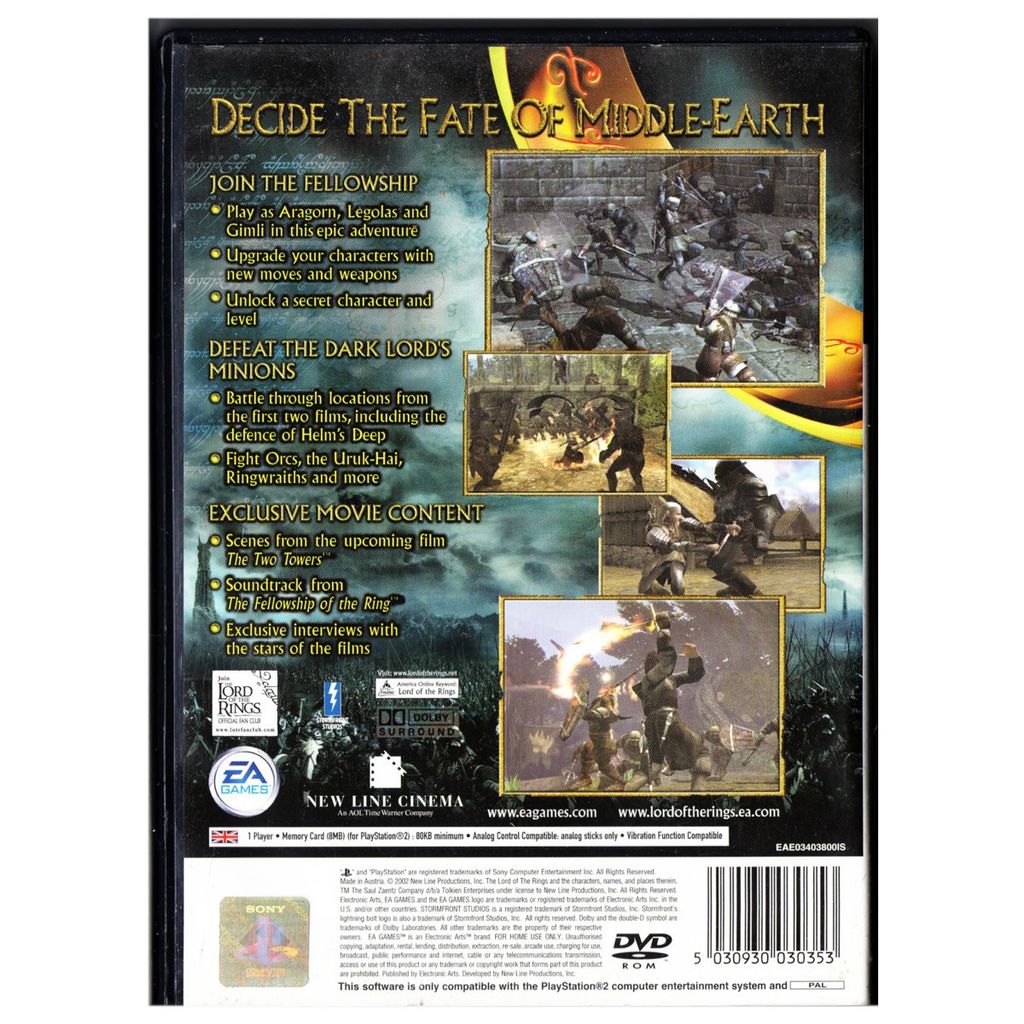 Precis som väntat av namnet är det här spelet direkt länkat till Peter Jacksons De två tornen-filmen, men det tar inte slut där. Nej då, EA har även tagit med lika mycket action från 2001-toppfilmen, Härskarringen. Generöst, eller hur? Spelet är en slags Golden Axe för den nya generationen, och är en slaktfest i tredjepersonsperspektiv där du kämpar mot orcharméerna i rollen av en av de tre brödraskapshjältarna: Aragorn, Legolas eller Gimli. Ta din hjälte genom de stora, kronologiskt ordnade stridsscenerna från de två filmerna i din kamp att hålla Frodo och härskarringen säkra från Sauron och hans anhängare samtidigt som du själv försöker överleva. Du kan förvänta dig autentiskt återskapad filmaction och en drakskatt av extramaterial.