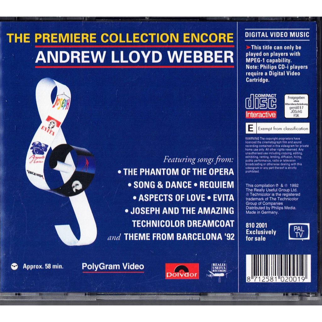 The Premiere Collection Encore – Andrew Lloyd Webber (CD-i) 🎼✨ Upplev mästerverken frĂĄn musikteaterns största ikon med The Premiere Collection Encore pĂĄ CD-i! đźŽđźŽ¶ Denna exklusiva samling bjuder pĂĄ oförglömliga hits frĂĄn Andrew Lloyd Webbers legendariska musikaler, inklusive The Phantom of the Opera, Cats, Evita och mĂĄnga fler. Njut av en audiovisuell resa fylld med klassiska melodier och ikoniska framträdanden – ett mĂĄste för alla musikalälskare! 🎤🌟