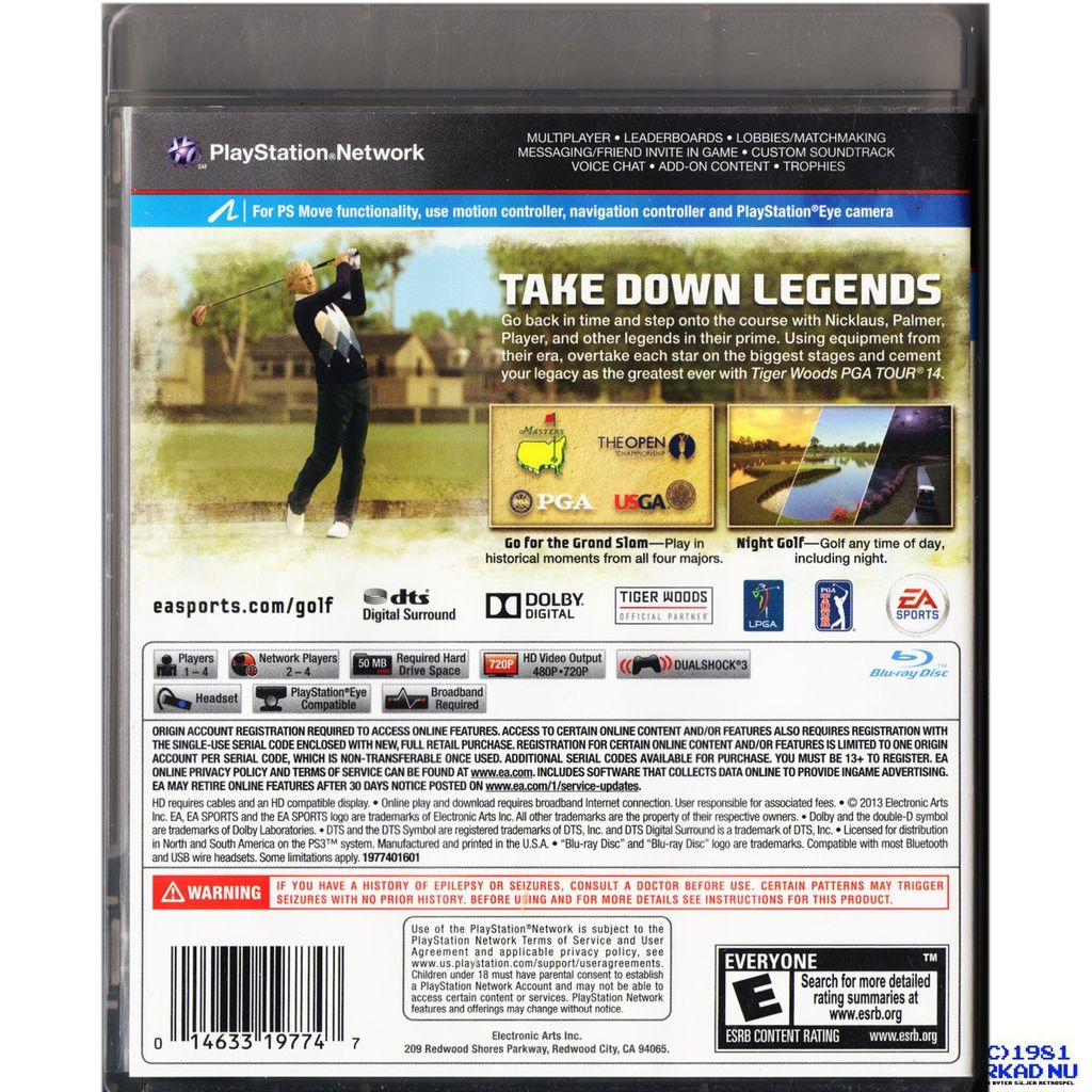 The world's number one selling golf video game franchise will take you back in time and celebrate golf's rich history by giving you the opportunity to play against iconic legends and relive all four golfs majors. Challenge some of the biggest names of golf, such as Arnold Palmer, Jack Nicklaus, Bobby Jones, Tiger Woods and others as you try to rewrite golf history on some of the world's most prestigious championship courses. Eclipse their legacies and earn your seat at the table of legends! Tiger Woods PGA TOUR 14 features the most courses ever offered on disc - a total of 20 courses. Another new feature to the franchise is the introduction of the LPGA. Take a break from the grind of tournament golf and play night golf, a first for the franchise, and watch your drives streak through the dark skies with an illuminated ball. Tiger Woods PGA TOUR 14 has something for everyone.