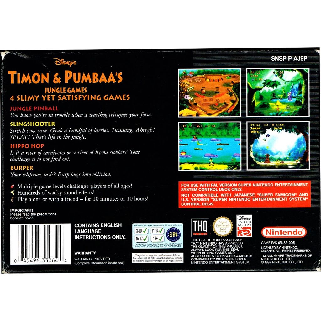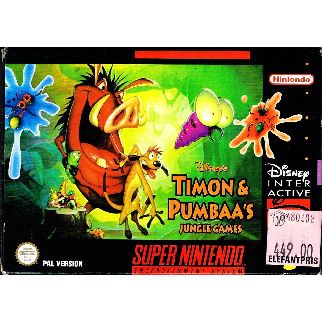 Timon & Pumbaa's Jungle Games is a video game for Super NES and Microsoft Windows, published by Disney Interactive (released under the Disney Gamebreak brand). The game was developed for Windows by 7th Level and released in 1995. It was developed for SNES by Tiertex and published by THQ. The game was released for SNES in November 1997 in North America and in PAL territories on March 26, 1998