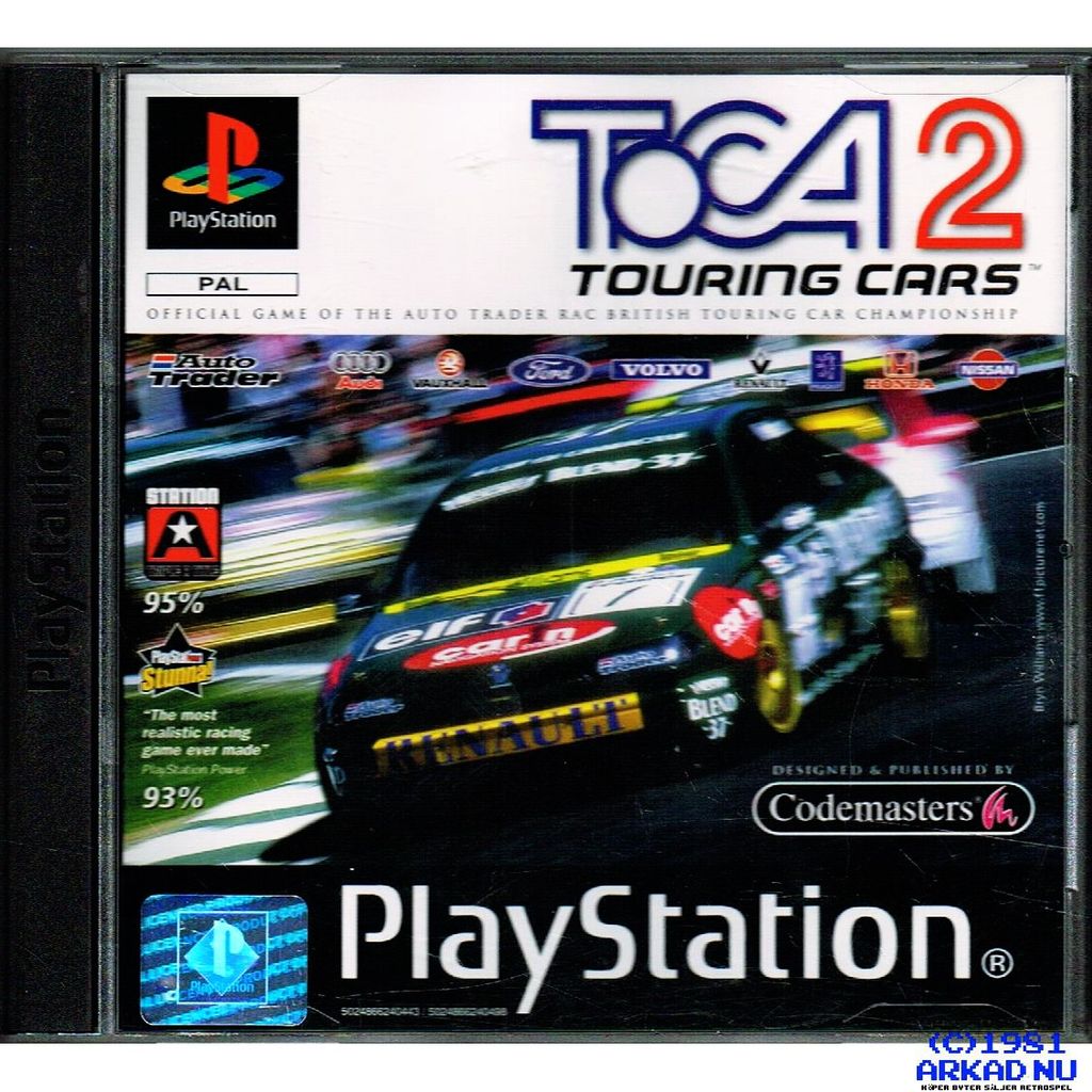TOCA 2: Touring Cars (TOCA 2: Touring Car Challenge in North America) is a British racing video game developed and published by Codemasters for PlayStation and Microsoft Windows. It is the second game in the TOCA series. Mainly an annual franchise update of cars and tracks, the game added more detailed graphics, physics, multiplayer modes and other minor features. Fictional (but realistic) tracks were added, and support races such as Ford Fiestas, Formula Ford and others also arrived. The level of car damage possible during a race was also enhanced, which was a significant selling point compared with the likes of Gran Turismo which had no damage model at the time. The main menu background music features "Retro", and the opening video "Soundclash" by E-Z Rollers. Other versions feature "Sole Sentiment" by Ratman in the opening intro.