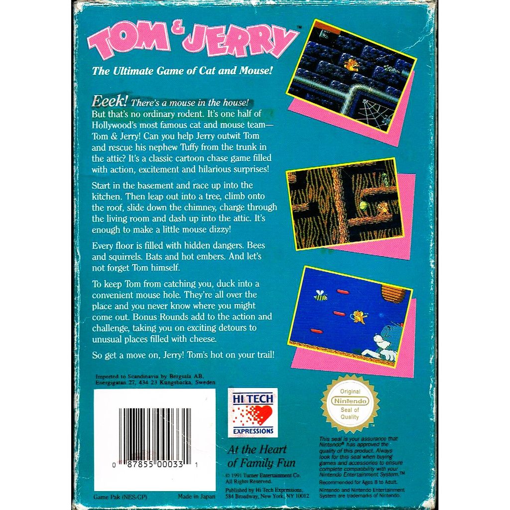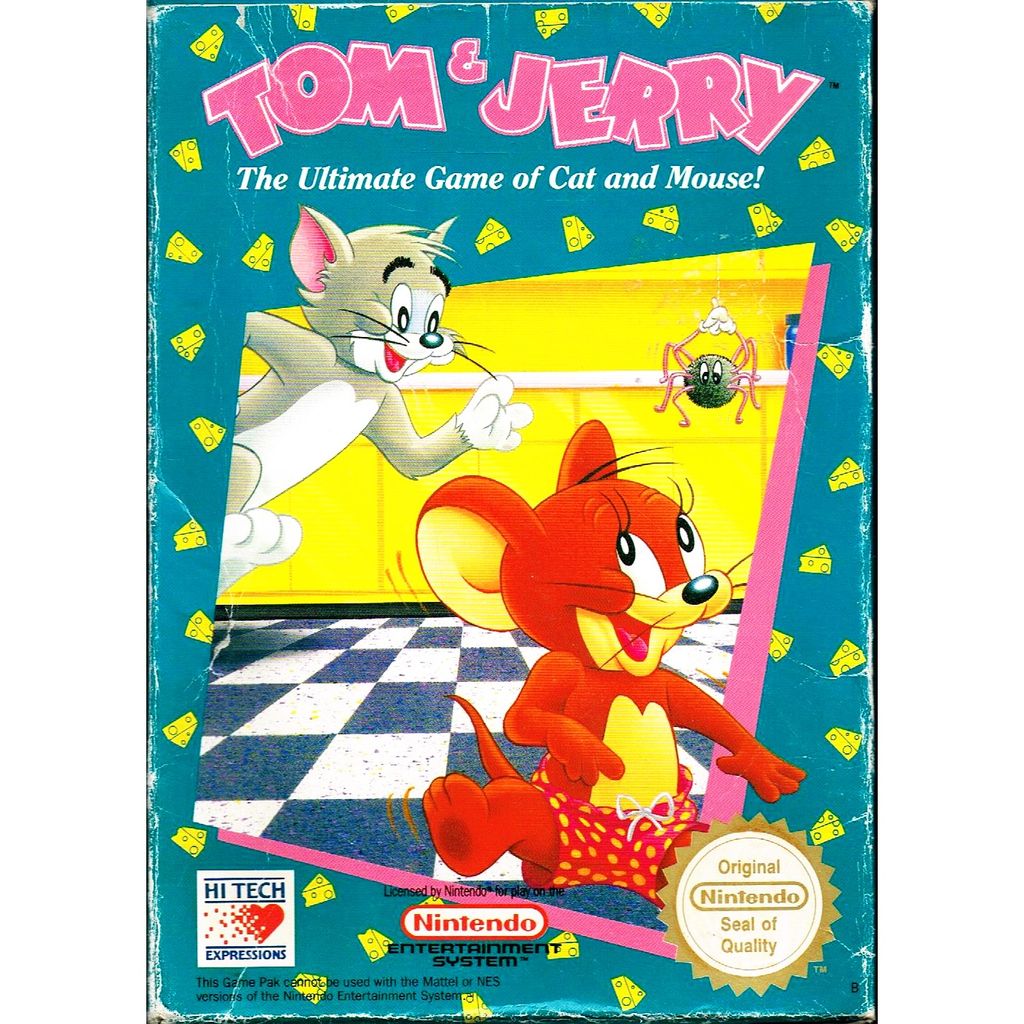 Tom & Jerry: The Ultimate Game of Cat and Mouse! also known as "Tom & Jerry (and Tuffy)" is a platforming game based on the cartoon show Tom & Jerry, developed by Software Creations, the same guys who brought us Silver Surfer, Pictionary, Solstice and other classics. The game has a very dull plot; Tom has taken Jerry's cousin Tuffy from him and Jerry must travel through 5 worlds with 3 stages. Each stage represents a certain theme. You'll find yourself in all kinds of places in the house; in the furnace, the kitchen, or even on top of an NES console. The game was developed by Software Creations staff members Paul Murray, David McLachan and Geoff Follin.