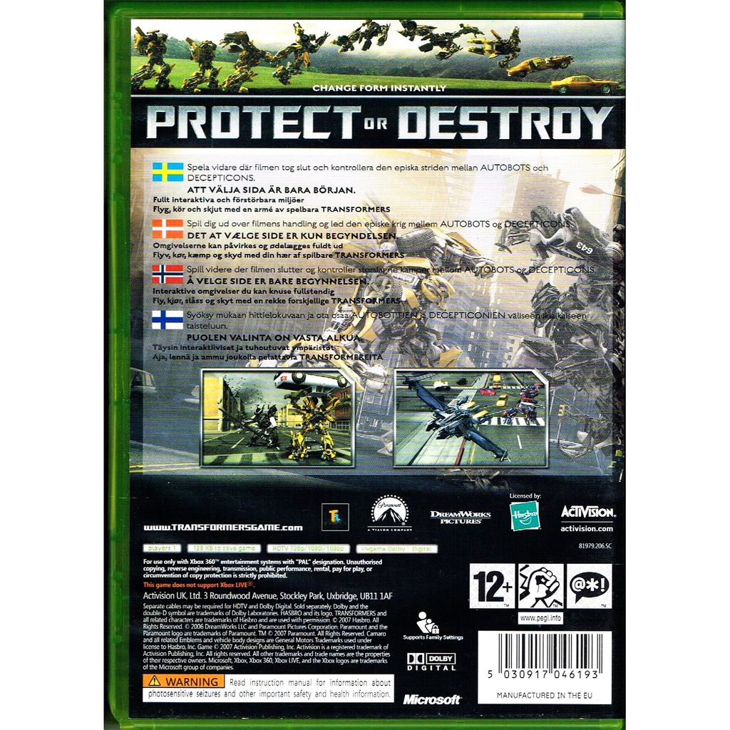 The game (in all its versions) is mainly a third-person action-shooter. All the robots have at least five attack types: a light weapon, a heavy weapon, a melee attack, and the ability to throw objects such as cars, lamp posts, trees, etc., and using a long object like a lamp post as a sword. As its title and characters imply, a robot can transform into a vehicle and vice versa, this gives the game some racing elements, as the player must, in some missions, race to certain point within a time limit or before a character of the opposing faction does. Each area is an open world environment, and there are also side-missions, Energon cubes and Autobot/Decepticon emblems scattered through the city, if accomplished successfully/collected the player can unlock trailers, production photos and unlock color schemes for certain characters.
