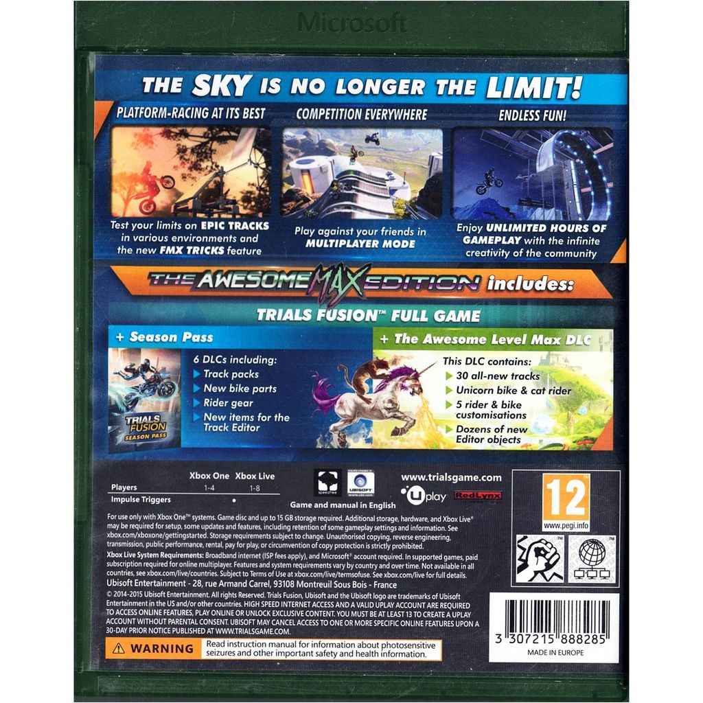 Ta dig an ett obegränsat utbud av plattformsracingutmaningar i Trials Fusion. Använd dina förmågor för att korsa rampfyllda hinderbanor och sätt banrekord mot de bästa Trials-spelarna från hela världen. Oavsett om du kör ensam, med vänner eller i en global turnering är tävlingen alltid omkring dig. Upptäck fördjupande världar och möt nya utmaningar i var och en av de 6 DLC-paket som bildar Trials Fusions Season Pass. Trials Fusion: The Awesome MAX Edition innehåller även den nya Awesome Level MAX-DLC:n, som lägger till en samling av nya banor och spelinnehåll, kombinerat med en unik Trials-upplevelse med en oförväntad hjälte som kör en väldigt speciell cykel... Denna nya DLC innehåller nivåer som är banor lika mycket som dem är äventyr!
