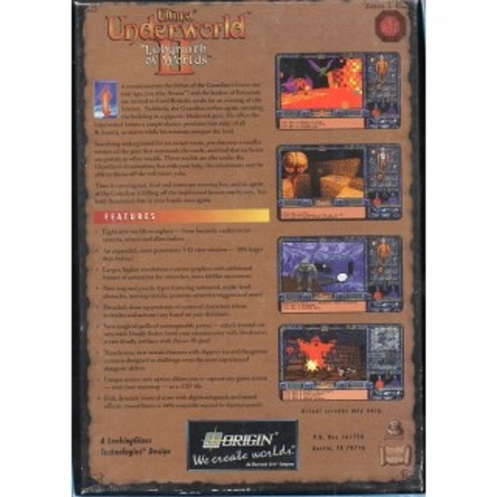 Ultima Underworld II: Labyrinth of Worlds is a 1993 first-person role-playing video game developed by Looking Glass Technologies and published by Origin Systems. As the sequel to Ultima Underworld: The Stygian Abyss, the game is set in the Ultima fantasy universe. Players assume the role of the Avatar—the protagonist of the Ultima series—and adventure through multiple dimensions while seeking to prevent the evil Guardian from achieving world domination. Progression is largely nonlinear and the game allows for emergent gameplay.