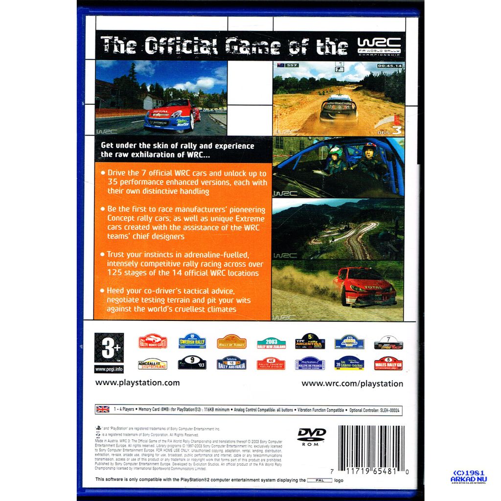 WRC 3: The Official Game of the FIA World Rally Championship (also known as WRC 2003) is a racing video game developed by Evolution Studios and published by Sony Computer Entertainment in 2003 as a part of the World Rally Championship series. The game was released for PlayStation 2 on November 21, 2003 in Europe, and later on May 27, 2004 in Japan (where it was published by Spike).