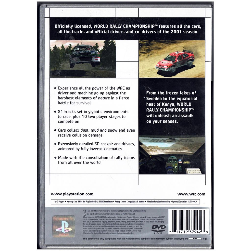 🚗💨 Det första officiella WRC-spelet till PlayStation 2 levererar intensiv rallyaction med alla bilar, förare och banor från 2001 års säsong. Kasta dig ut på slingrande grusvägar, hala issträckor och dammiga ökenetapper från hela världen – från Sverige till Safari Rally i Kenya.