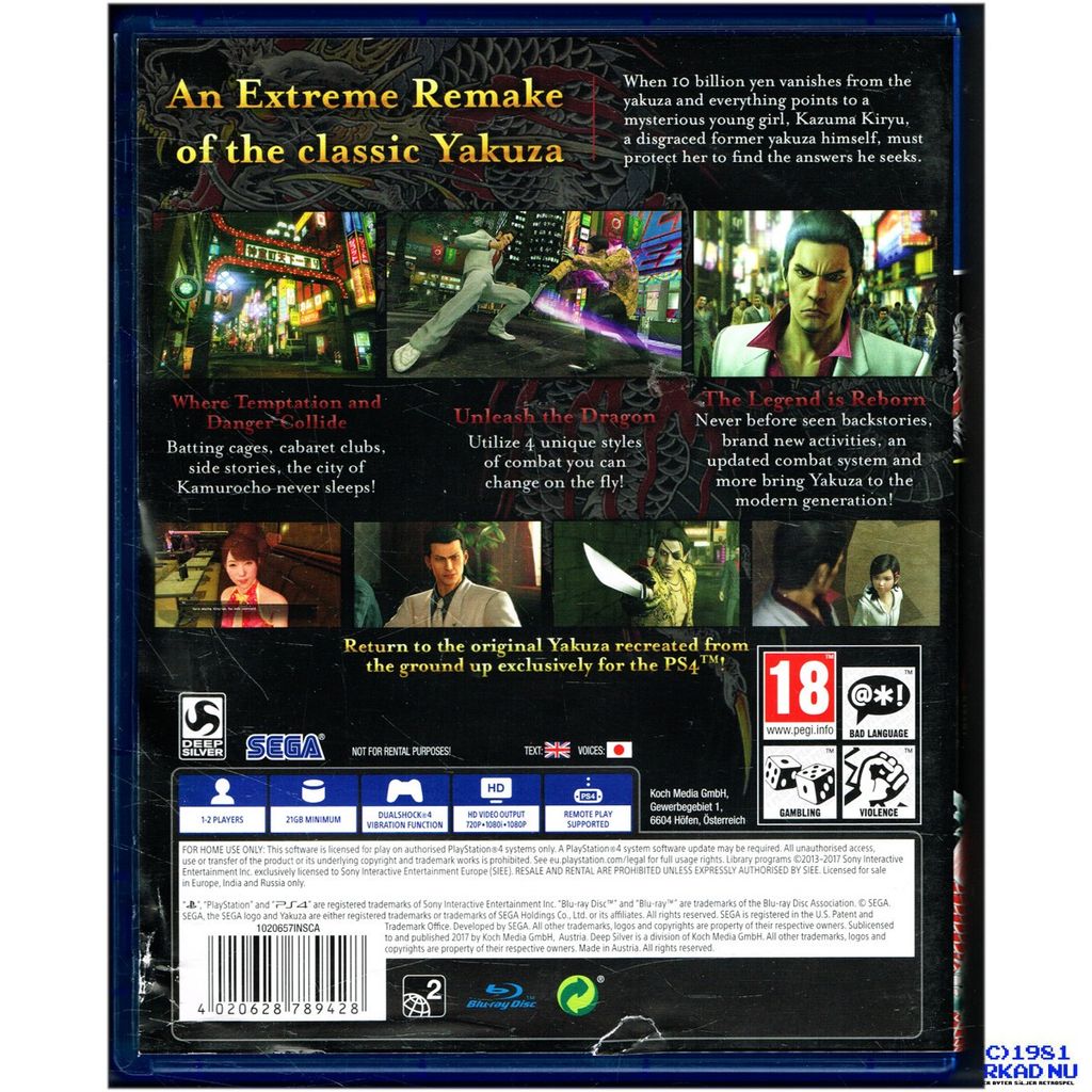 År 2005 föddes en legend på PlayStation 2- legenden om Kazuma Kiryu, the Dragon of Dojima, i hans tv-spelsdebut med Yakuza. Nu, 11 år efter det släpptes, kommer en ny generation spelare uppleva den ojämförliga actionen och dramat av Yakuza serien med den återbyggda från grunden HD-remake exklusivt för PS4- Yakuza Kiwami.