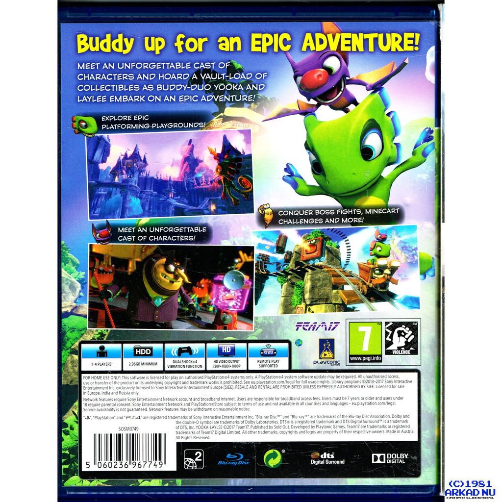 Du spelar som Yooka (den gröna) och Laylee (den lustiga fladdermusen med stor näsa) som med hjälp av sin kvicka tunga och sin ekolodsattack måste studsa, flyga, slå och banka sig fram genom en rad färgglada lekplatser fullproppade med märkliga varelser och skräckinjagande bossar.