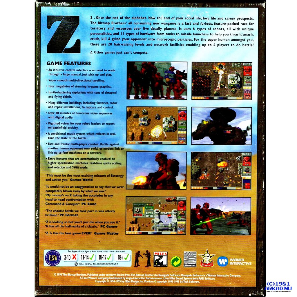 Z (pronounced Zed) is a 1996 real-time strategy computer game by The Bitmap Brothers. It is about two armies of robots (red and blue) battling to conquer different planets.