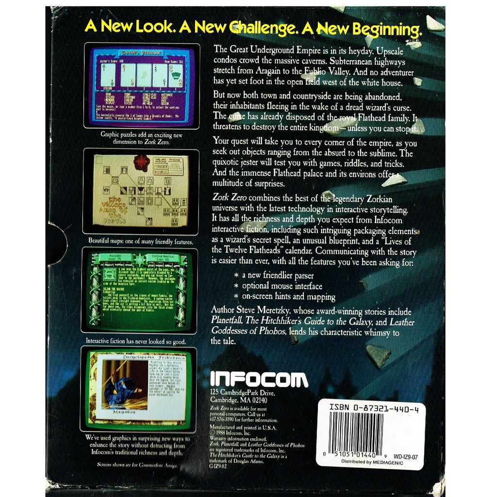 Zork Zero: The Revenge of Megaboz is an interactive fiction video game, written by Steve Meretzky over nearly 18 months and published by Infocom in 1988.Although it is the ninth and last Zork game released by Infocom before the company's closure, Zork Zero takes place before the previous eight games (Zork I, Zork II, Zork III, Enchanter, Sorcerer, Wishbringer, Spellbreaker and Beyond Zork). Unlike its predecessors, Zork Zero is a vast game, featuring a graphical interface with scene-based colors and borders, an interactive map, menus, an in-game hints system, an interactive Encyclopedia Frobozzica, and playable graphical mini-games. The graphics were created by computer artist James Shook. It is Infocom's thirty-second game.